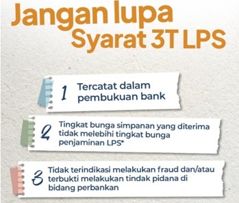 Simpanan nasabah dijamin oleh Lembaga Penjamin Simpanan (LPS) sampai dengan 2 Miliar Rupiah per nasabah dengan syarat simpanan memenuhi 3T