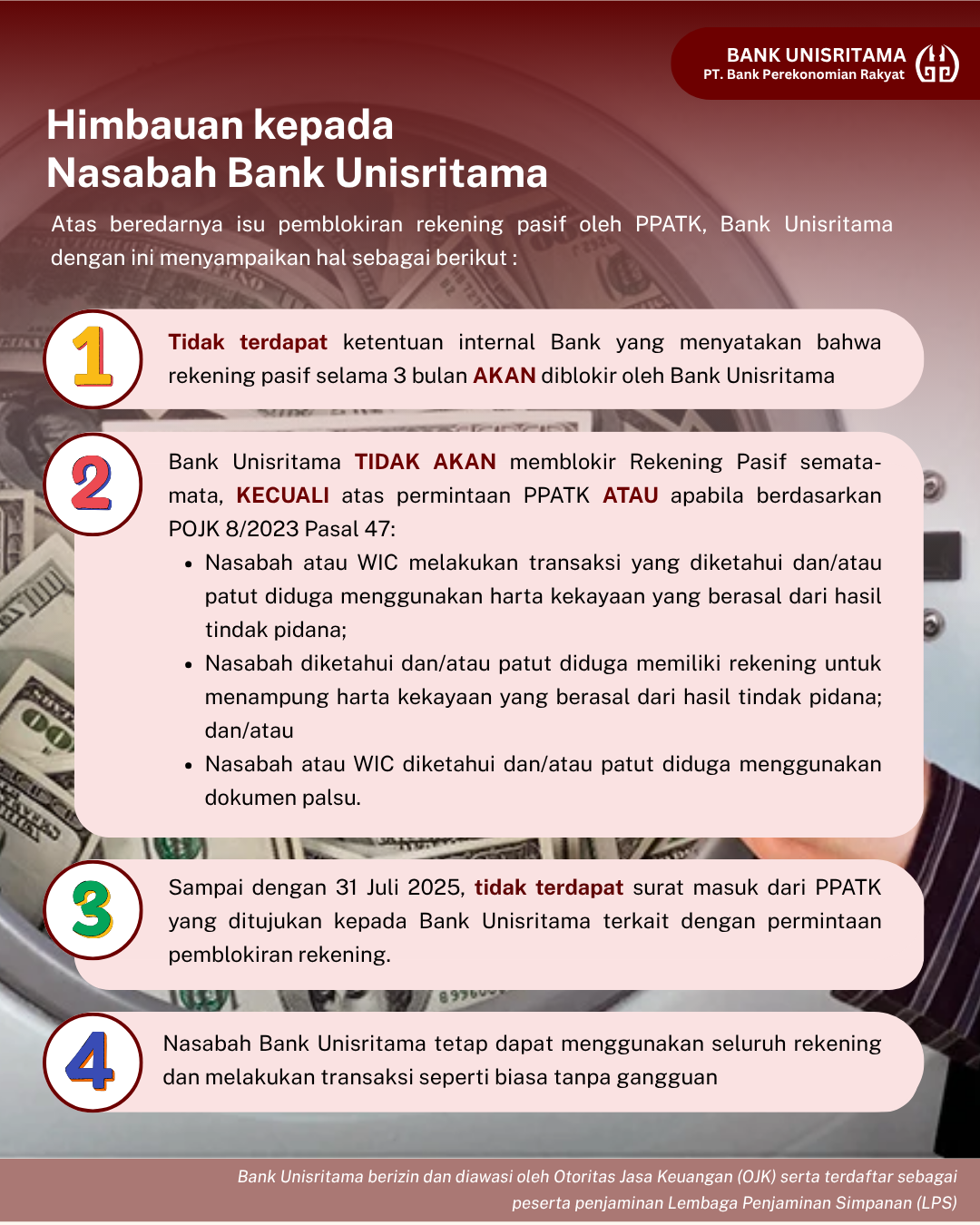 Sobat Unisritama, berdasarkan UU No. 4 Tahun 2023 tentang Pengembangan dan Penguatan Sektor Keuangan (UU PPSK) maka dengan ini, sejak tanggal 03 MEI 2024 PT BANK PERKREDITAN RAKYAT UNISRITAMA berubah menjadi :