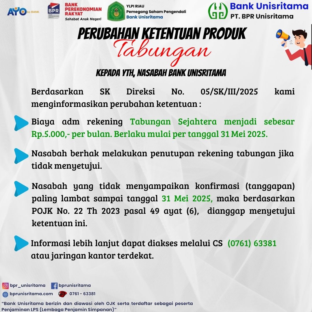 Untuk informasi lebih lanjut, silakan menghubungi layanan nasabah kami atau mengunjungi kantor cabang Bank Unisritama terdekat.