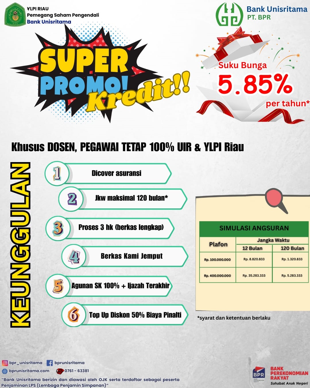 Ngapain nunggu nanti? Ada kredit bunga 5.85% per tahun nunggu kamu yang udah pegawai tetap, dosen, atau bagian dari YLPI Riau! Gak pake ribet, tinggal gaskeun ???? ? ???? Fix gaji tetap? Fix bunga rendah!