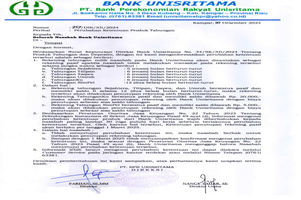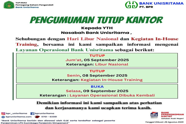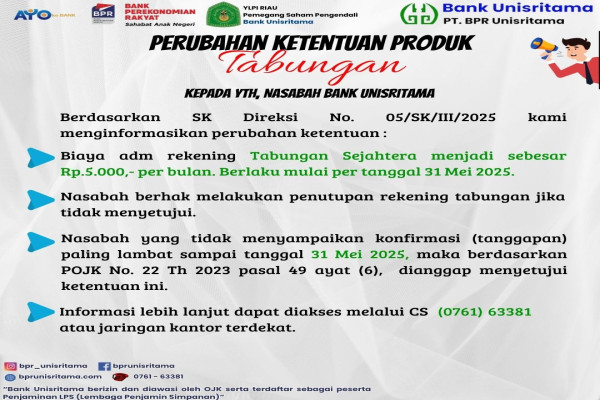 Menjamin simpanan dan pinjaman anda. BPR Unisritama terdaftar dan diawasi oleh OJK serta dijamin oleh LPS.