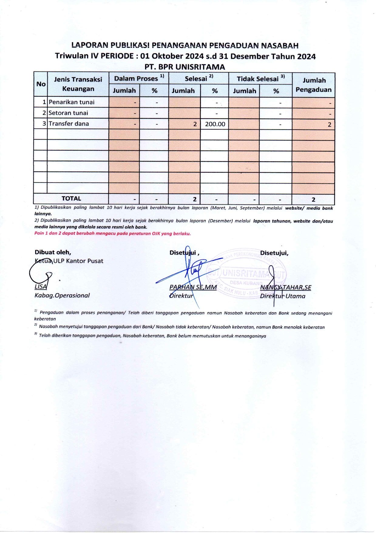 LAPORAN PUBLIKASI PENANGANAN PENGADUAN NASABAH TRIWULAN IV 2024